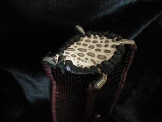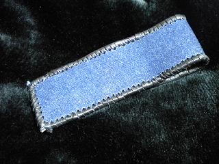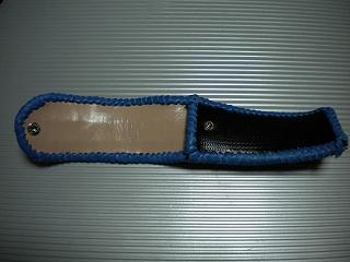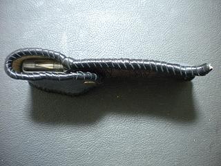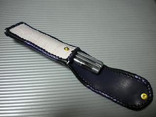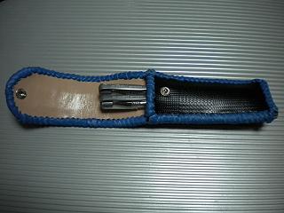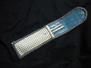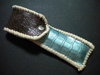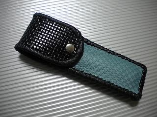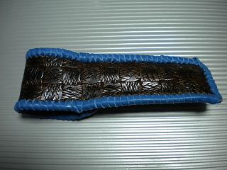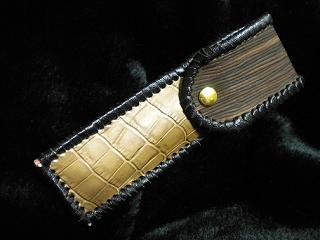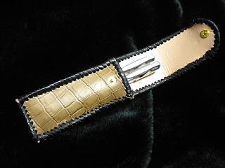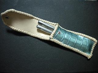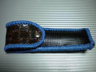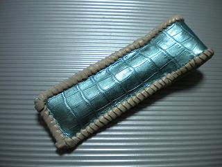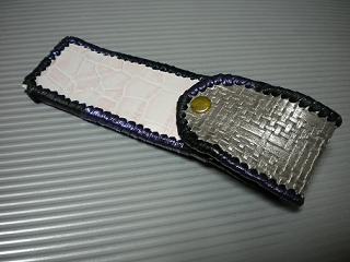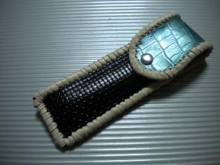 サイズは、縦17センチ×横5.5センチ。 15センチのペンが2本入ります。 表面の正面側は、編み込みデザイン型押しのブラックレザーを使用。 表面の蓋から、後ろ側にかけては、クロコ柄型押しのメタリックブルーレザーを使用しました。 ケース内側は、ブロンズメタリックレザーをを使用。 ケース周囲は、パールアイボリーのレザーで、かがり仕上げをしました。 |