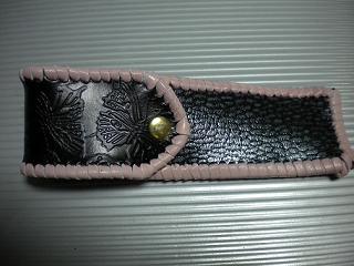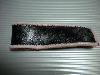サイズは、縦17センチ×横5.5センチ。 15センチのペンが2本入ります。 表面の正面側は、ブラックをベースに、グレーの斑点デザインのレザーを使用。 表面の蓋から、後ろ側にかけては、ブラックレザーに、蝶柄デザインを型押したものを使用しています。 内側は、ピンクン入ったレッドカラーのレザーを使用。 ケース周囲は、ピンクレザーで、かがりをして、仕上げました。 |