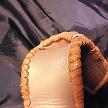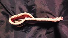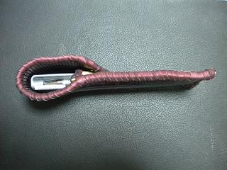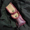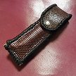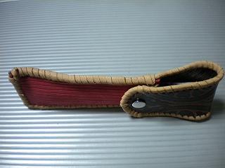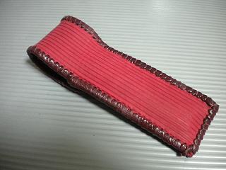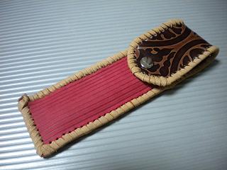 サイズは、縦17センチ×横5.5センチ。 15センチのペンが2本入ります。 表面の蓋から後ろ側にかけては、カッパーレッドの編み込みデザインレザーを使用しています。 表面の正面側は、草のツルデザインを型押した、濃いパープルレザーを使用しています。 ケース内側は、濃いレッドレザーを使用しました。 ケース周囲は、ピンクレザーでかがりをして、仕上げました。 |