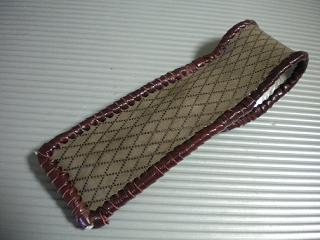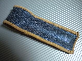 サイズは、縦17センチ×横5.5センチ。 15センチのペンが2本入ります。 表面の正面側は、ブラウンスエードレザーに、凸ドットのクロスラインをプリント加工したレザーを使用しています。 表面から、後ろ側にかけては、デニムのようなデザインのレザーを使用しました。 ケース内側は、ミントグリーンレザーを使用。 ケース周囲は、ホイートのレザーで、かがり仕上げをしました。 |