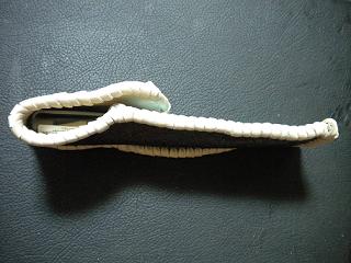 15センチのペンが2本入るペンケースに、印鑑を収納できるポケットを付けました。 ペン収納部分のサイズは、縦17センチ×横5.5センチ。 印鑑収納部のサイズは、縦7センチ×横5.5センチ。 ペンケースの表面、正面側は、バックスキン調のレザーに、レッド、グリーン、ブラックのラインをプリントした布生地のようなデザインのものを使用しています。 ペンケースの蓋から後ろ側にかけてと印鑑収納部の蓋表面は、花柄レース生地のデザインを型押したベージュピンクレザーを使用しました。 印鑑収納部表面は、メッシュデザインを型押したパープルメタリックレザーを使用。 ペンケースと印鑑収納部内側は、シルバーをベースにグレープカラーのぼかしデザインのレザーを使用しています。 ケース周囲は、ダークレッドレザーを使い、かがり仕上げをしています。 収納部分は、ふくらみを持たせています。 奥行1.2センチ×幅3センチあります。 市販の三文判、長さ6センチ×直径1センチの印鑑に対して、余裕を持たせています。 印鑑は、蓋が取れて、紛失してもいけないので、口がしっかりと閉まるようにしました。 この分、出し入れについては、上記の印鑑より大きいと口と蓋の間が狭いので、出しにくくなってしまいます。 取り出しには、底の部分をたるませているので、底を指で押せるようにして、取り出しやすくしています。 |