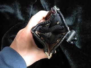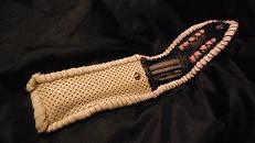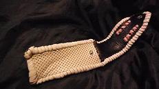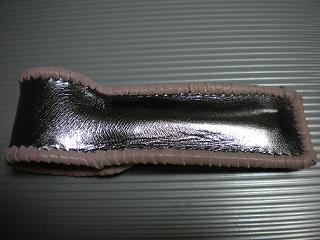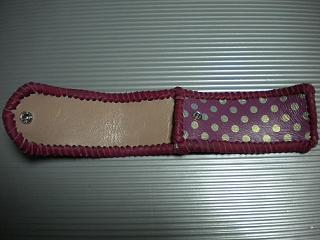 | 商品説明 | サイズは、縦24センチ×横11×幅7センチ。(底の部分は、横6センチ×幅4センチ) 15センチ〜18センチの長さのペンを入れることができます。 ケースの口は、スナップとヒモで固定して閉じます。 表面は、サークルデザイン型押しのグレープメタリックレザーを2枚、パープルクロコ型押しレザーを2枚使用しています。 ケース内側は、ピンクメタリックレザーを2枚、グレーメタリックレザーを2枚使用しています。 ケースの底は、ホワイト系のクロコ型押しレザーを表面と内側ともに、使用しました。 ケース周囲は、グレープメタリックレザーとブラックレザーを使い、かがり仕上げをしています。 |
