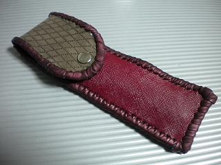 | 商品説明 | サイズは、縦17センチ×横5.5センチ。 15センチのペンが2本入ります。 表面の正面側は、クロスラインのブラックレザーを使用しました。 表面の蓋から、後ろ側にかけては、編み込みデザインを型押した、カッパーレッドレザーを使用しました。 ケース内側は、パールホワイトレザーを使用して、しあげました。 ケース周囲は、マルーンレザーで、かがりをして仕上げています。 |