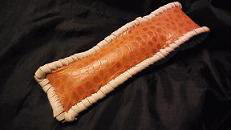 サイズは、縦17センチ×横5.5センチ。 15センチのペンが2本入ります。 表面の正面側は、モカブラウンのクロコ柄型押しレザーを使用。 表面の蓋から、裏側にかけては、樹木の表皮のようなデザインの型押しレザーを使用しました。 ケース内側は、ライトピンクレザーを使用しています。 ケース周囲は、ブラックレザーで、かがり仕上げをしました。 |