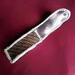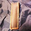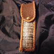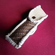 サイズは、縦17センチ×横5.5センチ。 15センチのペンが2本入ります。 表面の蓋から後ろ側にかけては、カッパーブラウンの編み込みデザインレザーを使用しています。 表面の正面側は、縦横編み込みデザイン柄型押しレザーで、シルバーとブルーメタリックのカラーでチェック柄のカラーをのせたものです。 ケース内側の正面側は、ピンクベイジュレザーを使用しました。 ケース内側の蓋から後ろ側にかけては、ロジーブラウンレザーを使用。 ケース周囲は、ブラウンレザーを使用し、かがり仕上げをしています。 |