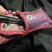 | 商品説明 | サイズは、縦17センチ×横5.5センチ。 15センチのペンが2本入ります。 表面の正面側は、素地のレザーに、花柄を残しワインレッドで、染色をしたものを使用しています。 表面の蓋から、後ろ側にかけては、レッドスネークデザインを型押したレザーを使用しています。 内側とケース周囲のかがりは、ピンクレザーを使用して、仕上げました。 |