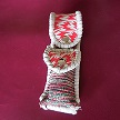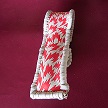 サイズは、縦17センチ×横5.5センチ。 15センチのペンが2本入ります。 表面の正面側は、ペイズリーデザイン型押しのパールグレーレザーを使用しています。 表面の蓋から、後ろ側にかけては、レッドのバックスキン調レザーに、等間隔の溝を型押したものを使用しました。 ケース内側は、クリームレザーを使用。 ケース周囲は、マルーンレザーで、かがり仕上げをしました。 |