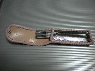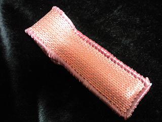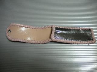 サイズは、縦17センチ×横5.5センチ。 15センチのペンが2本入ります。 表面は、メタルシルバーカラーの光沢感のあるレザーを使用しています。 内側は、ライトピンクレザーを使用。 ケース周囲は、ピンクレザーで、かがり仕上げをしました。 |