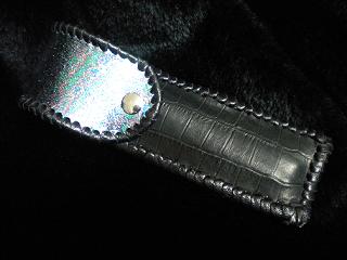 サイズは、縦17センチ×横5.5センチ。 15センチのペンが2本入ります。 表面の正面側は、クロコ柄型押しのブラックレザーを使用。 表面の蓋から、後ろ側にかけては、シャボン玉の油膜のようなカラーのレザーを使用しています。 ケース内側は、ライトピンクレザーを使用。 周囲の部分は、ブラックレザーで、かがりをして、仕上げました。 |