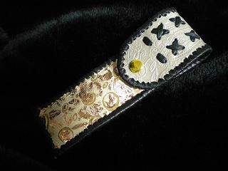 サイズは、縦17センチ×横5.5センチ。 15センチのペンが2本入ります。 表面の正面側は、イエローレザーに、大小の四角で構成されたデザインをパンチング加工したものを使用しました。 パンチングレザーの下地に、艶消しブラックレザーを使用して、貼り合わせています。 表面の蓋から、後ろ側にかけては、薔薇のデザインを型押したレザーを使用。 カラーは、シルバーをぼかした色合いのものです。 ケース内側は、クリームレザーを使用。 ケース周囲は、イエローレザーで、かがり仕上げをしました。 |