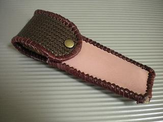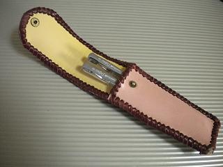サイズは、縦17センチ×横5.5センチ。 15センチのペンが2本入ります。 表面の正面側は、ピンクレザーを使用。 表面の蓋から後ろ側にかけては、細かい編み込みを型押した、カッパーブラウンレザーを使用しています。 内側は、クリームレザーを使用。 ケース周囲は、マルーンレザーで、かがりをして仕上げました。 |
