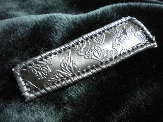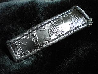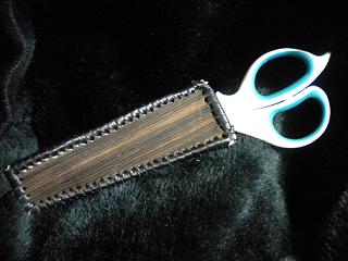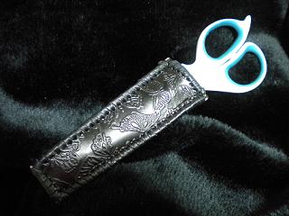 ハサミの刃先に被せるカバーです。 サイズは、長さは約14センチ、幅4.5センチ(長い方)、幅3センチです。 表面は、バタフライデザインを型押した、ブラックレザーを使用。 内側は、ライトピンクレザーを使用しました。 周囲は、ブラックレザーで、かがりをして仕上げました。 |