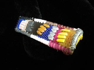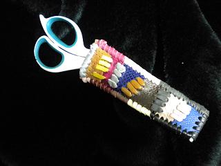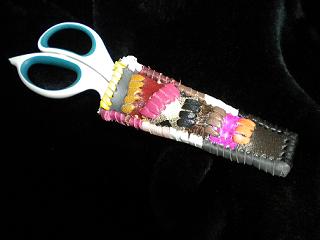 ハサミの刃先に被せるカバーです。 サイズは、長さは約14センチ、幅4.5センチ(長い方)、幅3センチです。 ケース表面は、レザーをカットしたものに、かがりをして、パーツをつなぎ、パッチワーク調にして、仕上げました。 ケース周囲の部分は、レザーをつないで、かがりをしています。 ケース内側は、ホワイトグレーレザーを使用しています。 |