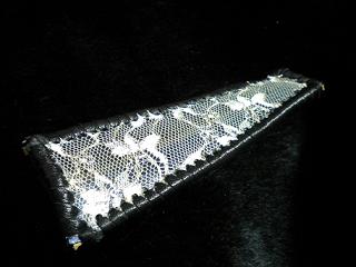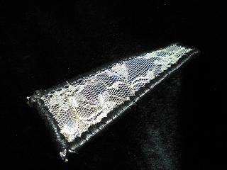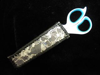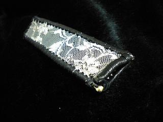 ハサミの刃先に被せるカバーです。 サイズは、長さは約14センチ、幅4.5センチ(長い方)、幅3センチです。 表面は、ブルーメタリックカラーのレザーをベースに、花柄のレース生地を貼りつけ加工を施したものを使用しています。 内側は、ホワイトアイボリーレザーを使用。 ケース周囲は、ブラックレザーで、かがり仕上げをしています。 |