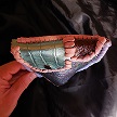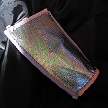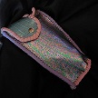 ケース寸法:幅11センチ、長さ17センチ、底の直径6センチ(円形部分) ケースは、平らな面と円形を組み合わせ、、少し膨らみを持たせたデザインになっています。 蓋と底の表面にレザーのパッチワーク調を用いています。 蓋の表面は、クロコ柄型押しブルーメタリックとブラウンレザーを使っています。 蓋の内側は、メタリックレッドをボカシたデザインのレザーを使用。 底の表面は、ブラウンレザーとボーダー柄をプリントした布生地のようなレザーを使っています。 底の内側は、メタリックレッドをボカシたデザインのレザーを使用。 本体表面は、シャボン玉の油膜のようなデザインの光沢感のあるレザーを使っています。 本体内側は、淡いパープルメタリックレザーを使用しました。 ケース周囲のかがりとパッチワークのつなぎのレザーは、ピンク、パープル、ライトブラウンレザーを使って仕上げています。 *画像にあるメガネは、13.5センチ×4.5センチのものです。 *メガネは、参考のためのもので、付属しません。 |